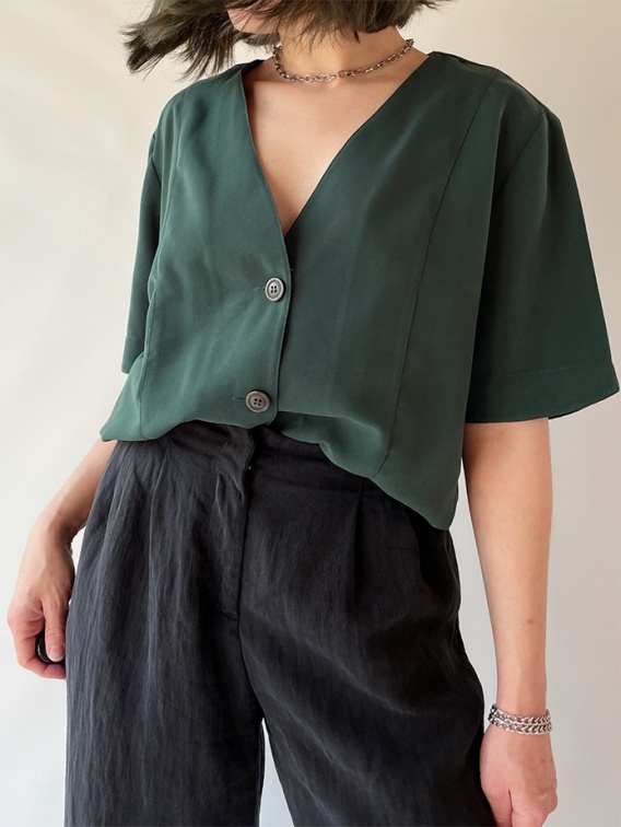 Zielony żakiecik/koszula z bardzo przyjemnego, gładkiego i chłodnego materiału. Nie ma metki ze składem, będzie to acetat albo cupro.