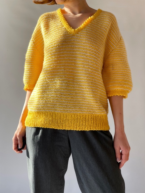 Żółto-biały, radosny sweterek z krótkimi, bufiastymi rękawkami. Handmade, nie ma metki ze składem. Materiał według mnie bawełna i akryl.
